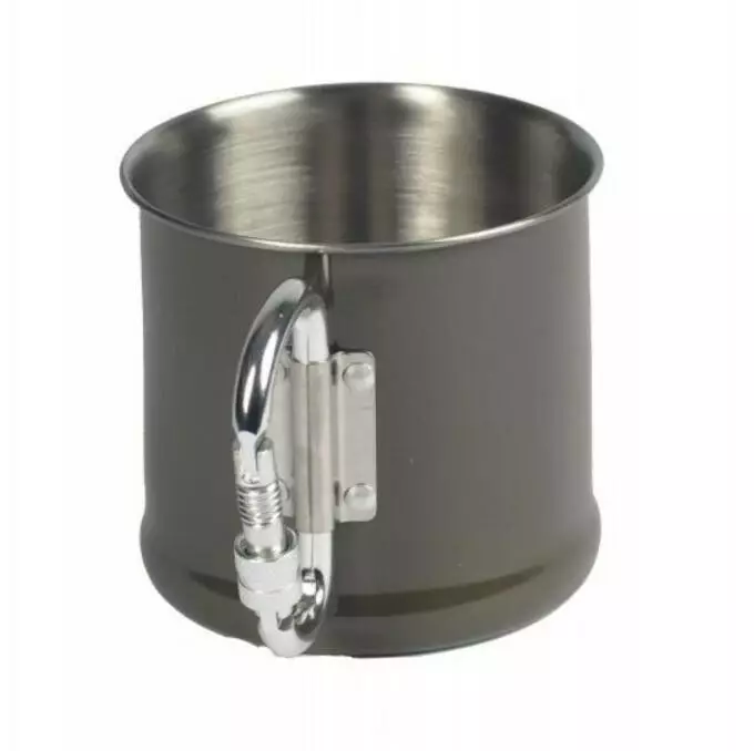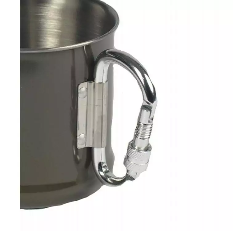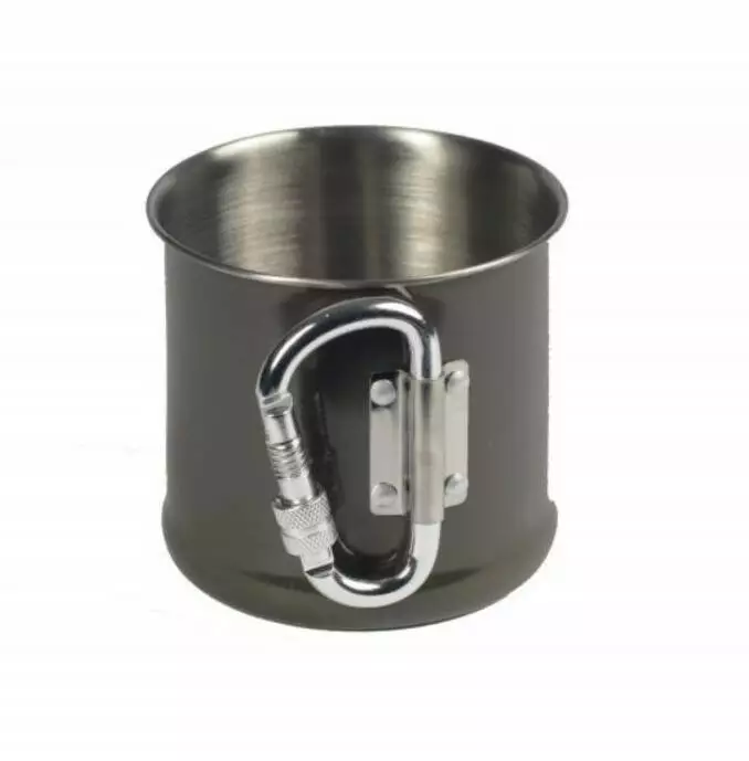 Чашка з нержавіючої сталі з прикріпленим карабіном. Він довговічний