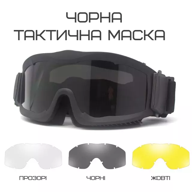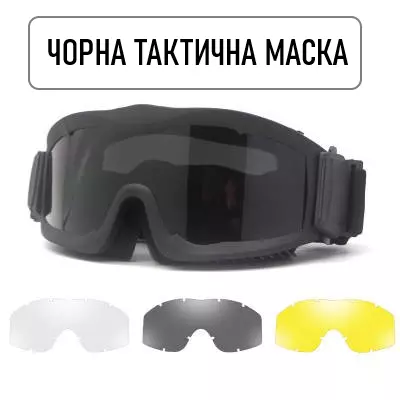 Тактична ударостійка маска з трьома змінними лінзами Чорна (товщина